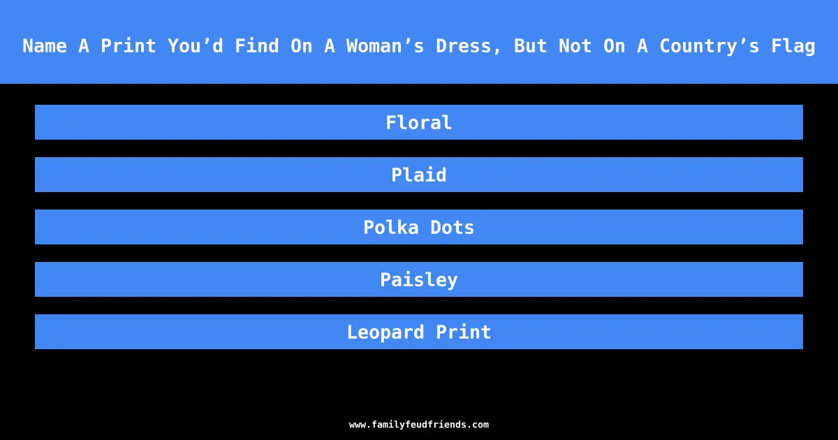 - Name A Print You’d Find On A Woman’s Dress, But Not On A Country’s Flag