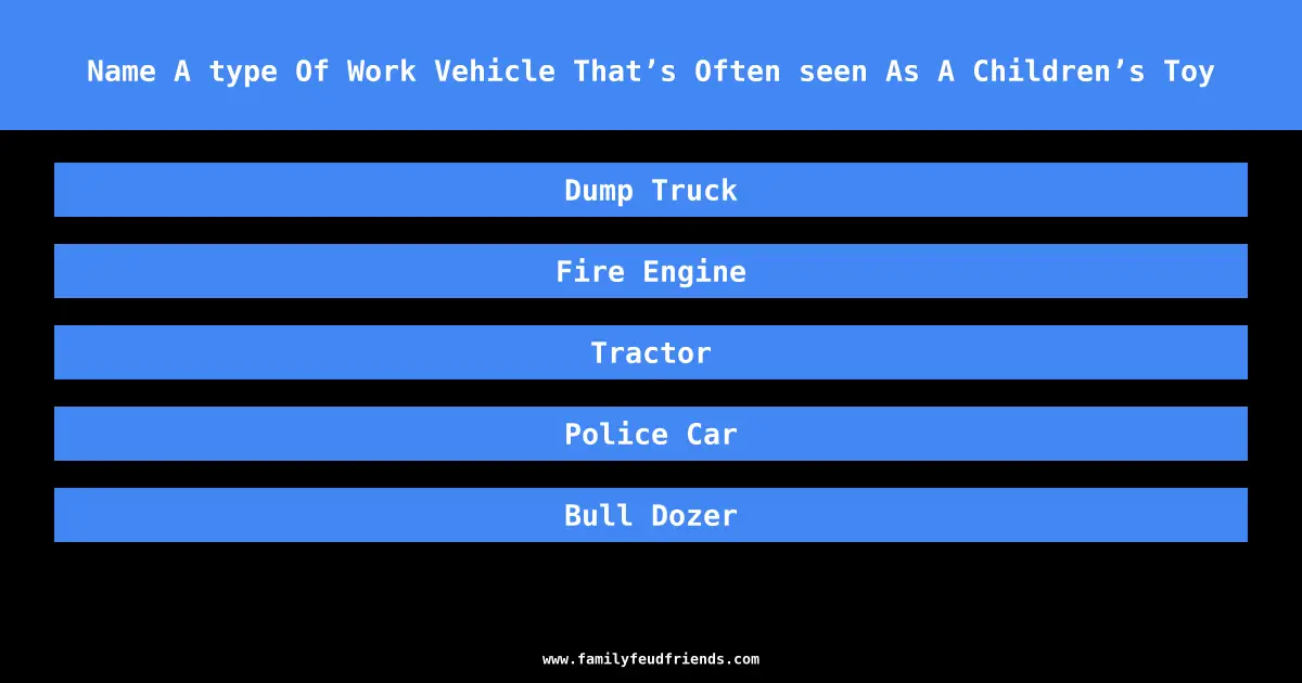 - Name A type Of Work Vehicle That’s Often seen As A Children’s Toy